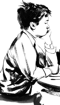 G: I took that script, that second part, and turned it into a story called M.A.R.S., with the idea that it was going to be easier to approach a new publisher with. I had trouble finding publishing for that and had trouble finishing it actually. It was a really enormous project. So, that got shelved, unfortunately. That was all done with brush and Sumi ink. It was great because I couldn't control it at all-- the exact opposite of the ballpoint pen. It kind of flipped around and did things I couldn't handle. It would make all these wonderful mistakes. I think it motivated me a lot more. I spent more time drawing it than I did doing the work I should have on the story and it kind of ran away from me. I ended up with a lot of drawings, but not the story to it. Since then I have really been working with the brushes.