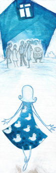 I opened my door and looked over at the group of people standing in various clusters around the front yard, laughing, leaning in to listen to gossip, nodding, holding plastic cups, asking where the bathroom is, looking serious and concentrated while monologues were being performed. What I was going to do over there was about as vague as my birth. I was wearing my brother's girlfriend's turquoise, pregnancy dress with little ducks on it. I looked somewhat like a little cone-shaped sack. And that's how I made my way across the street to join modern society.