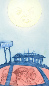 By the time we pulled into our first motel of the trip, the moon had turned electrically yellow, and it sat fat against a deep blue sky. It looked like some over-zealous prop-guy had gotten carried away and created a fantastic moon that no one in the audience would take for real. Except that it was real.