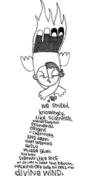 S: To see those people holding hands, there’s something really beautiful about that. So, there was that image, and the realization of what the word “kamikaze” meant-- “divine wind”. The whole idea of these two people meeting each other, falling in love, and never saying a word. And then, the first time they physically touch, they brush shoulders, the first boom happens, and they have associated it with themselves.