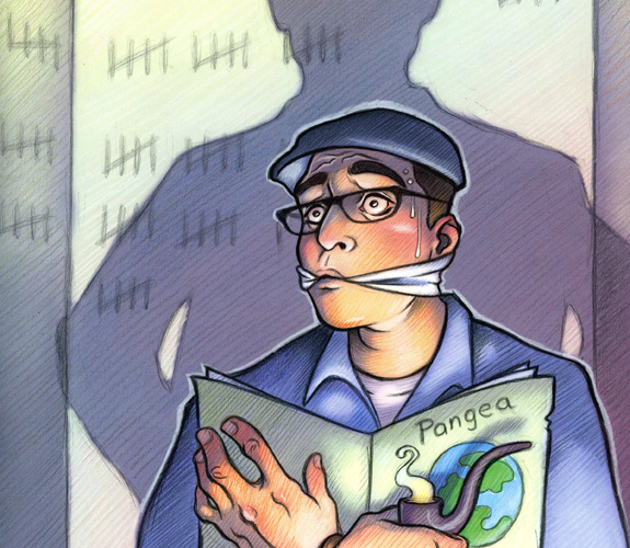 TUCSON, AZ - For years, the scientific community has accepted the idea of a giant Jurassic landmass known as "Pangea". Last Thursday, at The International Scientific Conference, a new theory on the origin of the seven continents was presented to the... okay, I think Wayne has stopped reading this. Please, help. I have been kidnapped by an "Insane" magazine editor.
