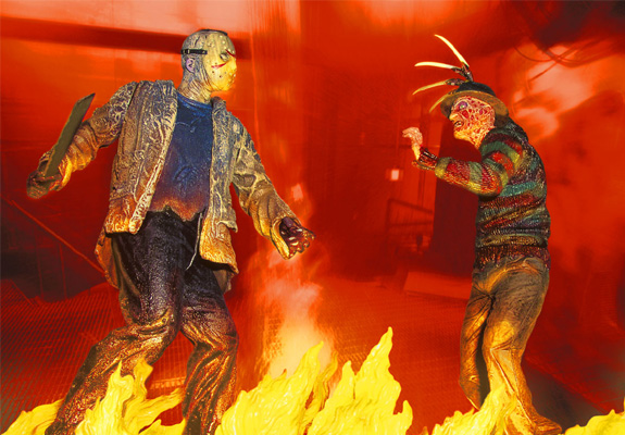The movie was an orgy of severed limbs, slaughtered, obnoxious, scantily clad teenagers, and spraying blood of Niagara Falls proportions. It was only a matter of time before action figures were created to commemorate this clash of titans, and it took NECA toys to create a set worthy of such drama.