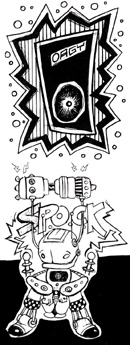 ORGY: Where can you combine hardcore, synth-pop, metal, and sci-fi in perfect unison? At the Orgy show last month! Alien Ant Farm, Spineshank, and Orgy performed a killer show at the Newport. AAF blasted off with their unique style and child-like antics. Along with their cover of “Smooth Criminal,” they ruled the beginning of the show. Spineshank, and their mind-drilling songs, churned the pit into a sweat-soaked frenzy. This loyal bot got his fair share of kicks and hits. But I’m used to it, because Wayne beats me all the time. At the end of the night, the beautiful boys of Orgy took the stage with their glowing guitars and shimmering make-up. (growl) They sent out hits from their new album and a few old classics, which seemed to go on forever. After weakening the knees of the girls in the crowd (and mine), they vanished. I'm telling you for your own good, if you get a chance to catch these space kids, do it. I'm not asking. I'm ordering. wayne will touch me again if you don't. So, please, if you have a heart, don't let him hurt me again.