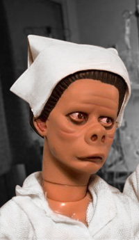 This month’s toy set depicts an all time classic: The Twilight Zone episode “Eye Of The Beholder”, also known as the episode with “pig people dudes in doctor outfits,” as the store clerk put it when I bought it. The set, brought to you by Sideshow Toys, contains the 12” tall, malformed Doctor, and equally messed up Nurse from the episode. Sideshow Toys sixth-scale dolls are usually outstanding, but nothing prepared me for this set. To put it precisely, it is fan-frickin’-tastic (with emphasis on the “frickin’”). The sculpting of their faces, performed by artist Mat Falls, wonderfully captures not only the ‘60s make-up, but also an appropriate facial expression to boot. The Doctor might be misshapen, but he has a very compassionate expression taken directly from the end of the episode. Equally, the nurse has a very subtle, apprehensive expression, as if she is slowly trying to sneak a peek at a “disfigured” patient. The paint at first appears very simple, however, a lot of care was directed toward both of their eyes. The pupils and eyelids have been carefully painted, and they’re finished off with a gloss coat to make them seem alive. There is even a dark wash around each eye to make them appear more sunken. Every great head needs a good body (God knows I know), and each creepy hospital attendant sports a spiffy, highly articulate body. The outfits on the show were very basic hospital clothes, yet Sideshow still did a great job constructing them while adding a few little touches. The doctors shirt has neat little buttons and pockets sewn on. He even has removable shoes with socks. The nurse isn’t too shabby either, with her simple, yet elegant, faux pearl buttons, and silky smooth pantyhose that boldly seem to scream, “Take me, take me, take me to the Ice Capades!” They both come with a nice assortment of accessories, ready to mangle a patient to their distinction of beauty. Each comes with their own base, but you also get a stethoscope, syringe, pack of gauze, and a watch.