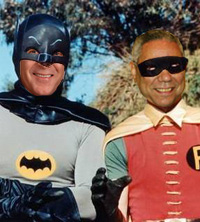 So Colin and I slid down the Badpoles, which changes us into our costumes. We were no longer mild-mannered Colin Powell, Secretary of State, and pretty-damn-daft George W. Bush, President of Lake Superior. We were Badman and Colin! We hopped into the Badmobile-- Colin drove, because I can’t reach the pedals-- and drove over to Iraq.