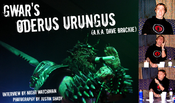 SINCE ESCAPING THEIR IMPRISONMENT IN ANTARCTICA, GWAR HAS BEEN SPEWING EVERY BODILY FLUID KNOW TO MAN ON AUDIENCES FOR THE PAST 20 YEARS. THE END OF 2004 FINDS THEM REFOCUSED WITH A NEW CD-- WAR PARTY-- SURE TO COMPLETE THEIR SCHEME FOR WORLD DOMINATION. NIGHT WATCHMAN GOT A CHANCE TO SIT DOWN WITH DAVE BROCKIE (A.K.A. ODERUS URUNGUS) BEFORE A SHOW AND GOT HIM TO SPILL HIS GUTS ABOUT WHAT IT TAKES TO KEEP GWAR GOING AFTER ALL THIS TIME.