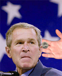 So, around 11:30, we turn on the ol' NBC affiliate to watch Jay Leno, the funniest man alive! I think Jack Ruby or Ruby Dee or Dee Snyder was on. Whatever. Point is, all of a sudden, midnight hits, and 2004 disappears! Poof! Gone! Faster than your civil liberties! In its place: 2005. That’s right-- a whole new year. Where did the old one go? I don’t know. It’s not like that trick my daddy used to do, where he’d make a quarter disappear from his hand, and reappear behind my ear. Or the one he did back when he worked for the CIA, where he made poor black people disappear by pumping crack cocaine into the inner-city neighborhoods.
