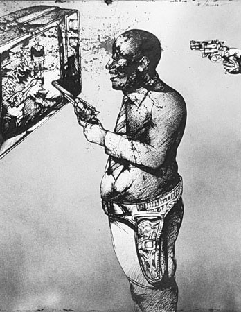 MA: Yeah. It’s interesting to me-- I’m one of those people who works on positive energy, in terms of creating. If you beat me, meaning you heavily criticize me or try to demean me or whatever, I don’t respond well to that. I want to punch you in the mouth, but I don’t want to do better work. The thing about Vonnegut and the thing about illustration is that it's not the illustration itself, it’s the side things that pop up. So I did this book, I had forty-five drawings of basically guns, but it was about violence, and everybody said to me, "You’ve got a book." So I went to publishers, and they said, "Oh my God. We can’t print this book. It’s too violent." And then they said to me, "If you get somebody famous, maybe, maybe we’d consider printing the book." So I sat down and said, "Okay, of all the people in the world, who would I like to write about what I’m doing?" I had been reading a lot of Vonnegut, and I liked his dark humor. So I got his address from somebody, and I sent him a note with a bunch of Xeroxes of the drawings. So one night the phone rang, and my wife said, "It’s Kurt Vonnegut!"