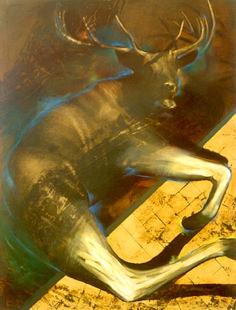 MA: Well, I think it started there. It’s funny, I’m a slow learner. When I was thirty years old I had tried to be a successful illustrator for the previous three years. I had never made over $3,000 in any of those given years, and consequently failed. Now I’m thirty, now I’m looking at my portfolio and thinking, "You know, I’ve been making pictures for other people here. I’ve not been making pictures for me." So I made a list of the things that I actually know something about, and what came up on that list was cows. I grew up on a dairy farm and I had never drawn a cow. (laughs) Deer-- we hunted them, we ate them-- never drew one. Psychic phenomena-- I didn’t know where to put that. And guns-- been around guns, whatever. That was my list. That’s what I had knowledge of. And I’m now sixty-six still working on that list of four. The animal component came in, and I’m still fascinated by it. I actually think that we are animals with a sense of spirituality, so I’m fascinated by animals carrying certain kinds of knowledge. I see auras, so I painted them around people. And then I thought, "Well, animals can be equally sacred." So I painted monkeys with the idea that monkeys carry the knowledge of Asia. Then I painted the cat to carry the knowledge of the Middle East. And then I went on to paint the buffalo to carry the knowledge of Native America. So they are, in my own brain, metaphors, if you will. As time goes on this gets more complicated. At the moment I’m doing a series of what I call "cave paintings", and all the shamans in the caves-- the people who did these drawings-- were trying to move from the material world to the spiritual world, and they all had animal helpers. So I’m now doing a series of humans transforming into animals. That’s basically what it is.