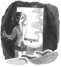 Creaking stairs and shuffling footsteps. Lenore was standing before me; eyes hidden in the shade as her cigarette traced red arcs through the accusing dark. Her blouse was untucked and unbuttoned. Someone's hands had been through her hair.